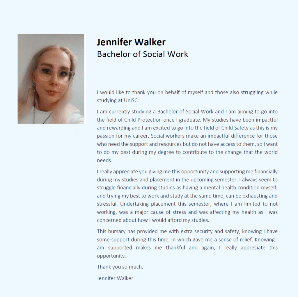 The Boar Group Study Support Bursary assists students from low socio-economic backgrounds, with a preference for students who must work to support their studies.