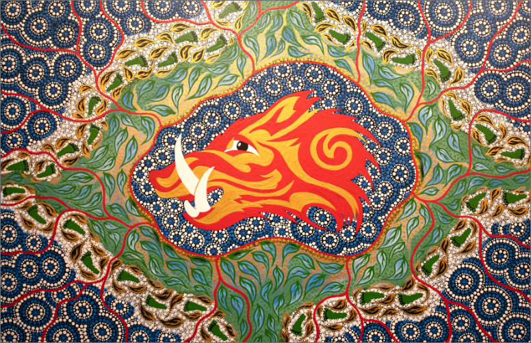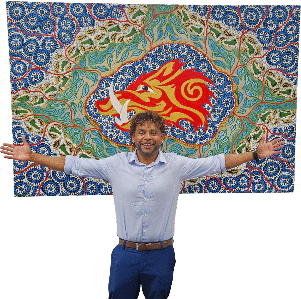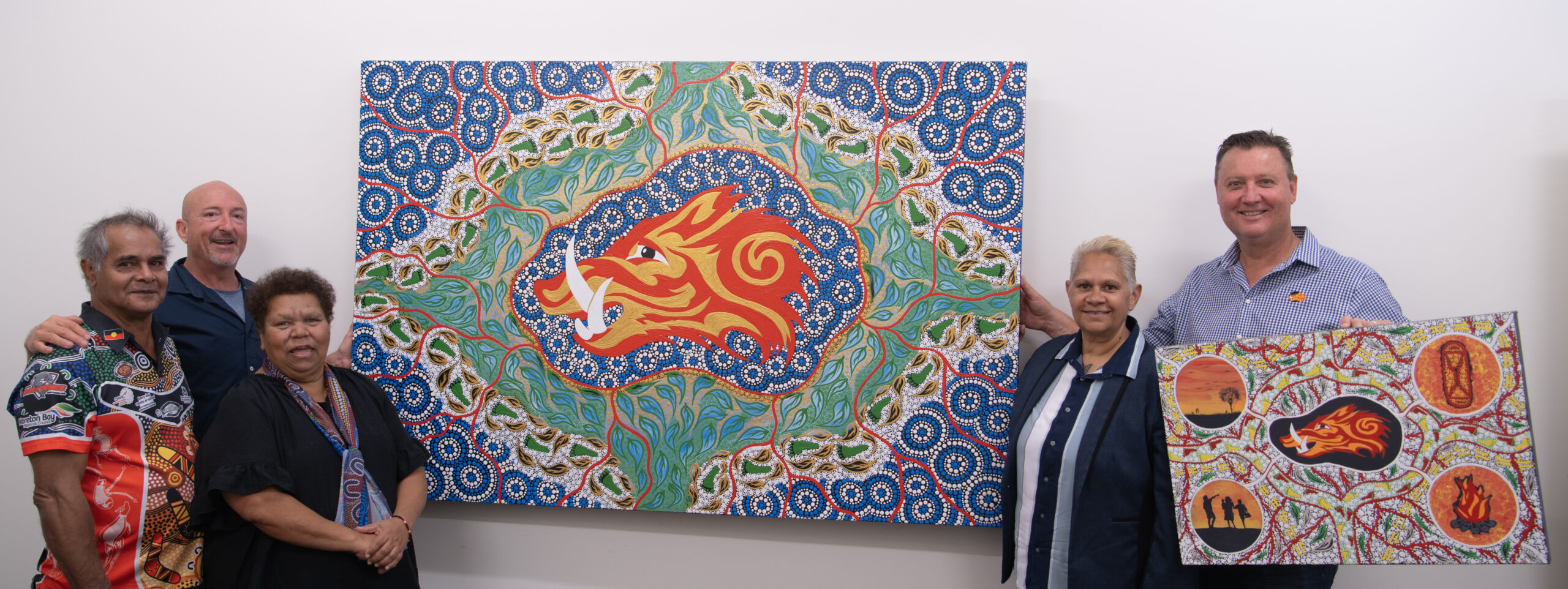 Boar Group has committed to two artworks painted by Hal and received the largest piece we have ever commissioned from an artist. This beautiful piece that was presented to us by Hal’s Aunties and Uncle during a morning tea for National Reconciliation Week.